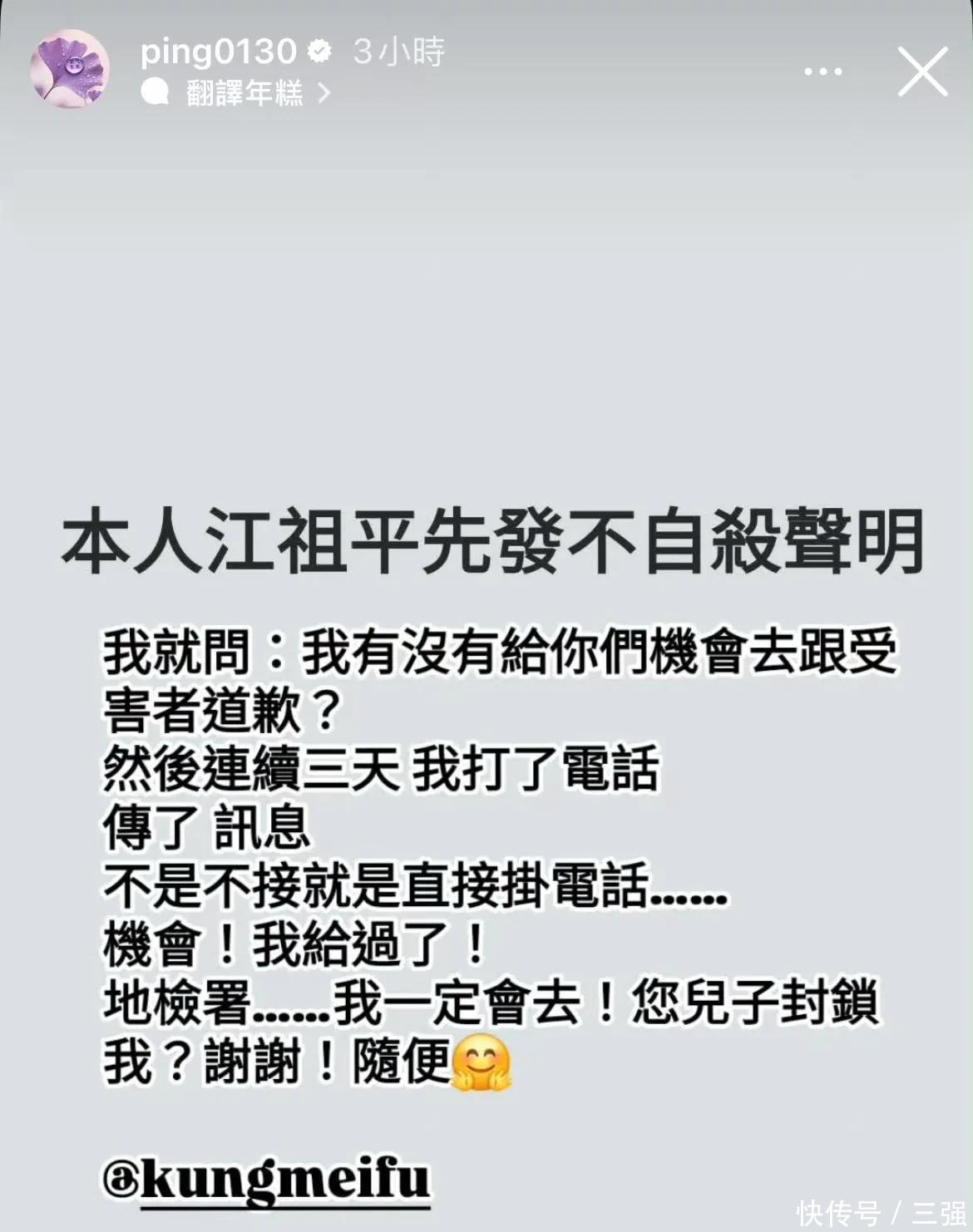 可江祖平表示“两人早已分手”,被性侵后怕遭报复,连外卖都不敢点,甚至在外网上发了两次“不自杀声明”。
